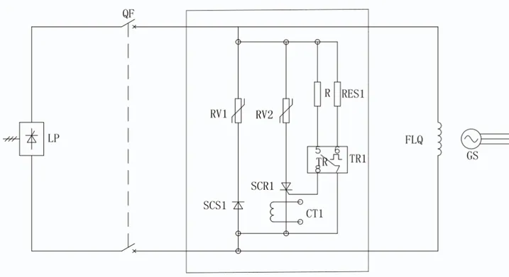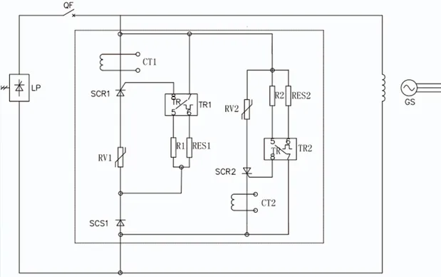 As can be seen from the diagram, by adding SCS1 and SCR1, the nonlinear resistor is turned off under normal operating conditions, limiting the leakage current. The selection of R and RES1 is determined based on the design calculations of the overvoltage set value.